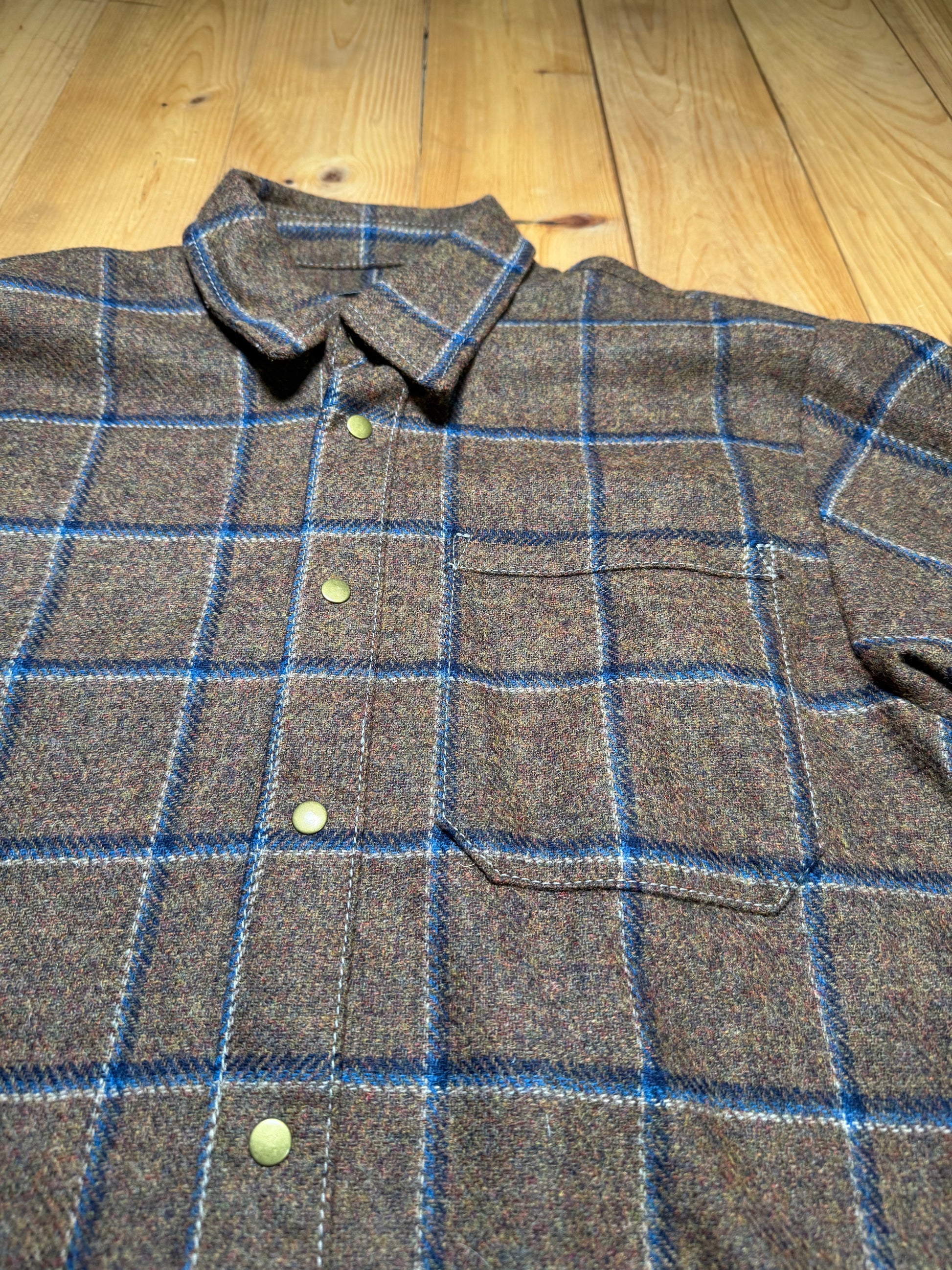 The ... is a wool over shirt made from 100% virgin wool dead-stock suiting fabric. It is cut generously cut allowing layering under, includes a straight hem an also has antique brass snap buttons.